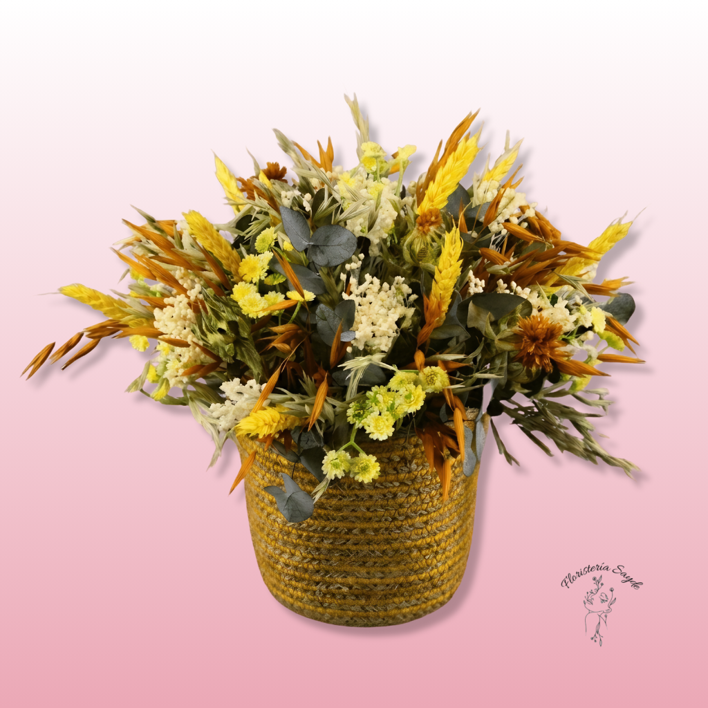 En el arte de la decoración floral, pocos elementos logran transmitir esa sensación de hogar y serenidad como un centro de flores secas. En Floristería Sayde, hemos querido capturar la esencia de los campos dorados y la quietud de la naturaleza en una pieza diseñada para perdurar. Este arreglo no es solo un objeto decorativo; es una composición artesanal pensada para quienes buscan una belleza que no exige mantenimiento, pero que regala una atmósfera acogedora y sofisticada a cualquier rincón.
