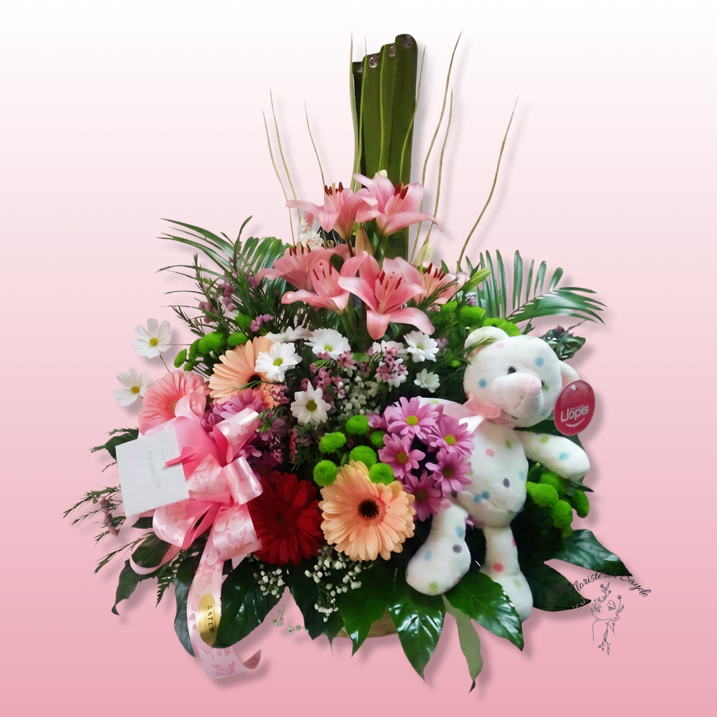 Centro de flores nacimiento con peluche