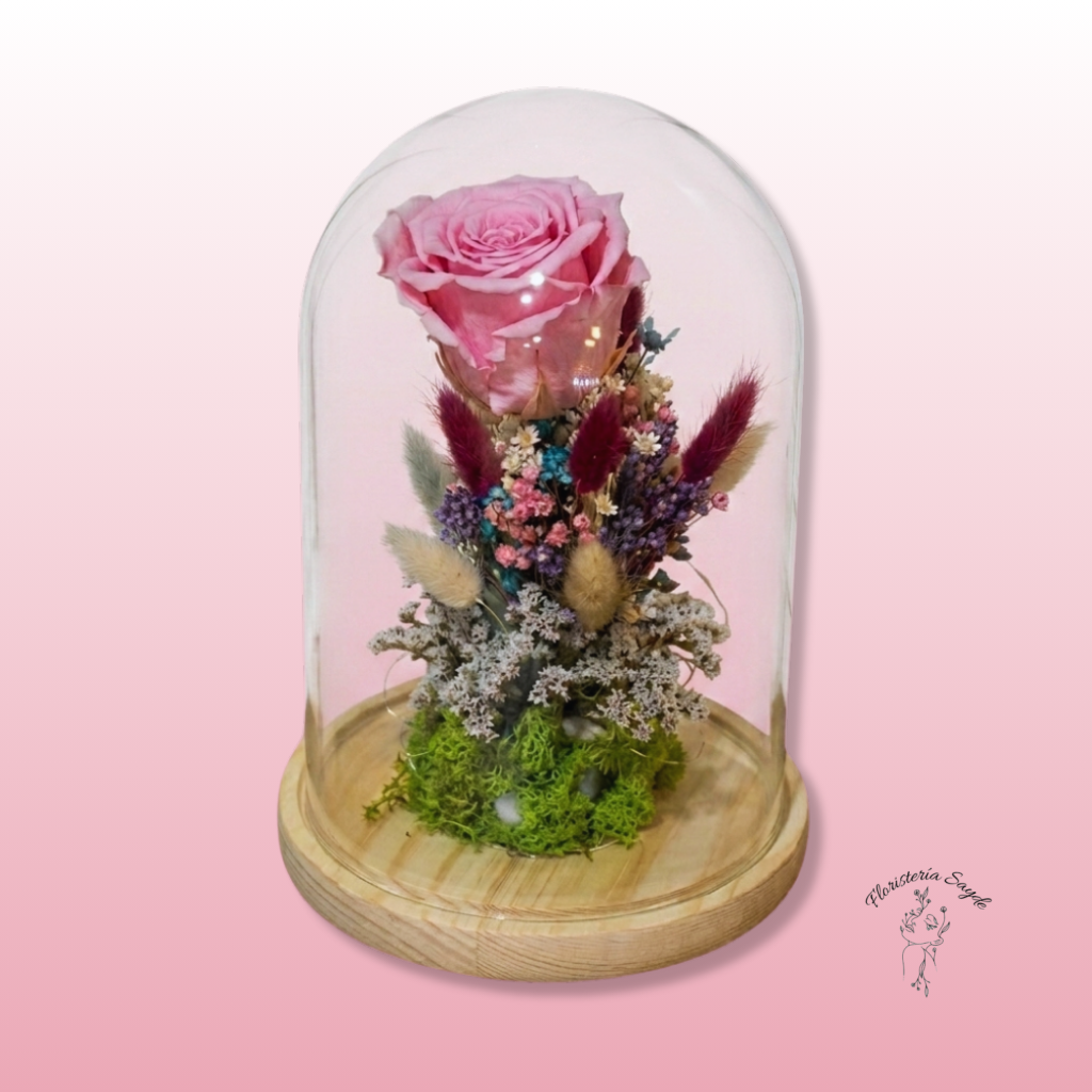 Lo que hace única a nuestra cúpula rosa eterna rosa es el ecosistema botánico que acompaña a la flor principal. No se trata de una rosa solitaria, sino de una composición artística completa. En la base, un lecho de musgo preservado de un verde intenso aporta una sensación de frescura natural. Sobre este musgo, se disponen flores auxiliares como la paniculata teñida en tonos suaves, phalaris y pequeñas flores silvestres que añaden texturas y volúmenes variados.