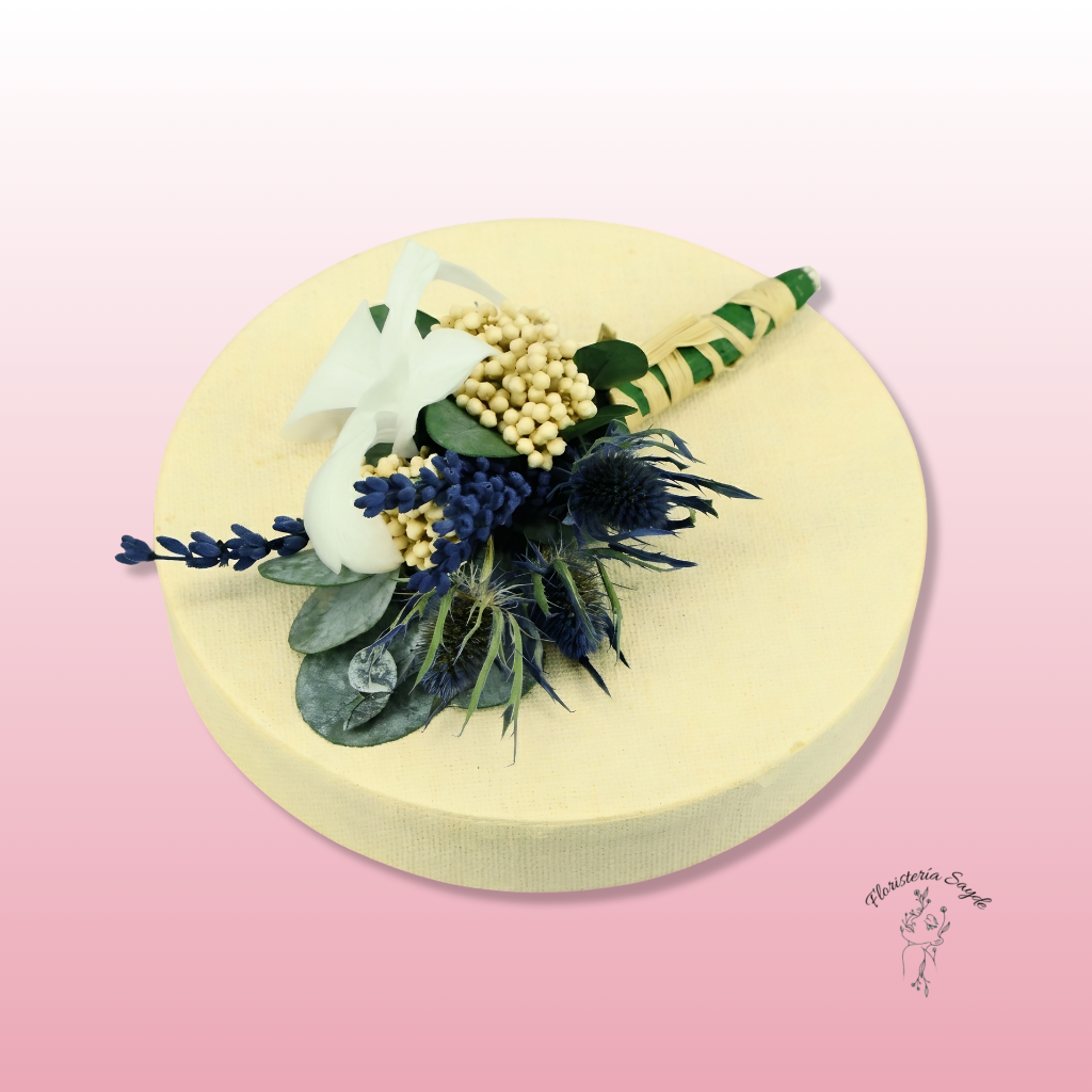 Prendido floral azul y blanco con lavanda y eucalipto. Un diseño elegante y natural, ideal para bodas y eventos especiales.