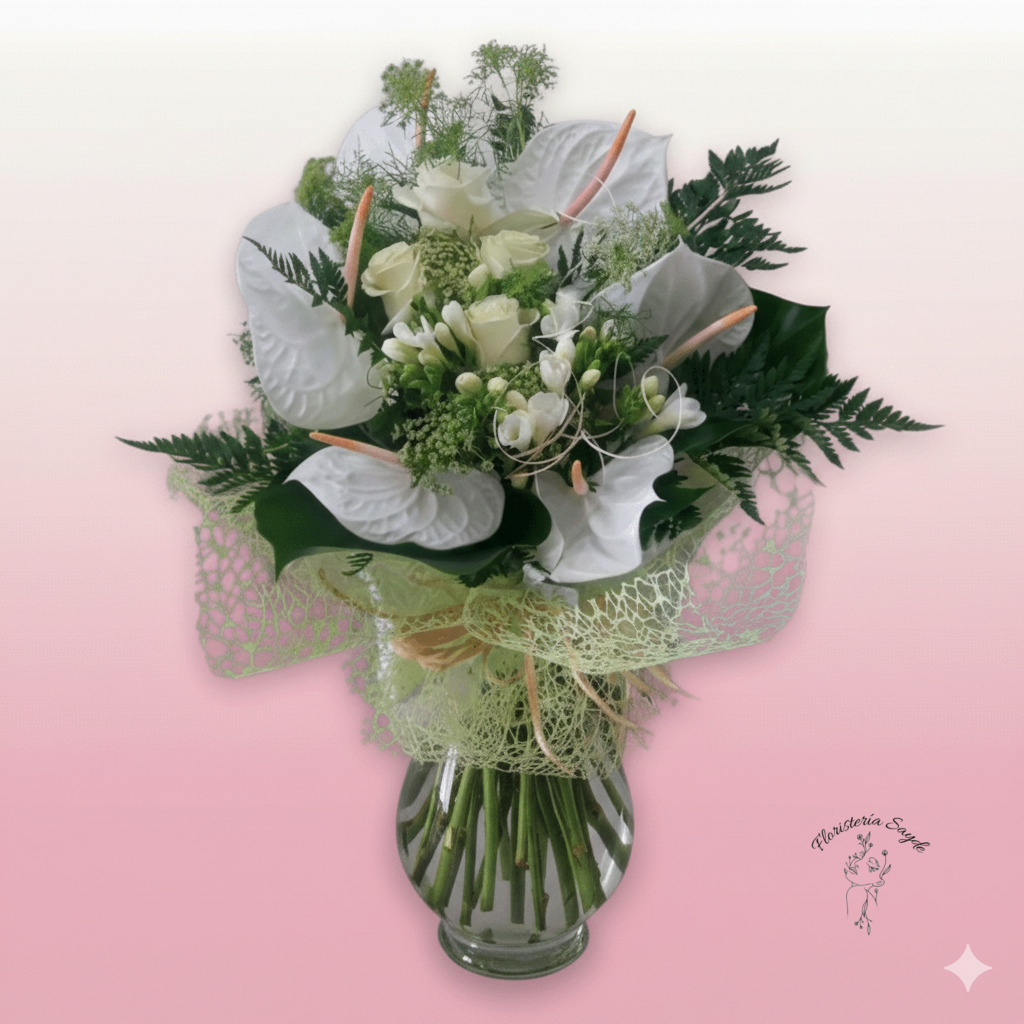 Ramo con rosas blancas y anthurium blanco de Floristería Sayde. Un detalle sofisticado y elegante para cualquier ocasión especial.