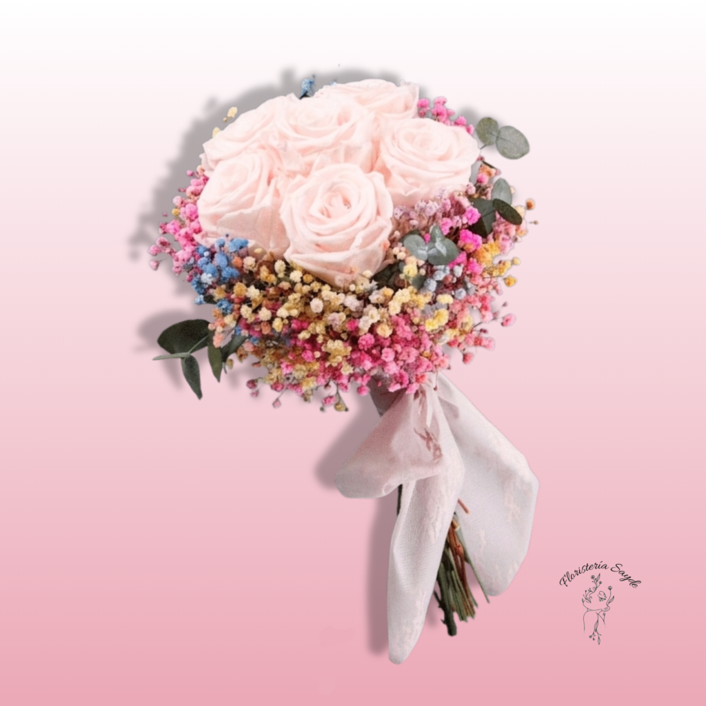 Romántico ramo de novia de flores preservadas rosadas y multicolor. opción perfecta para un recuerdo eterno de tu boda. Este hermoso diseño combina tonos rosados y multicolor, logrando una apariencia única y elegante