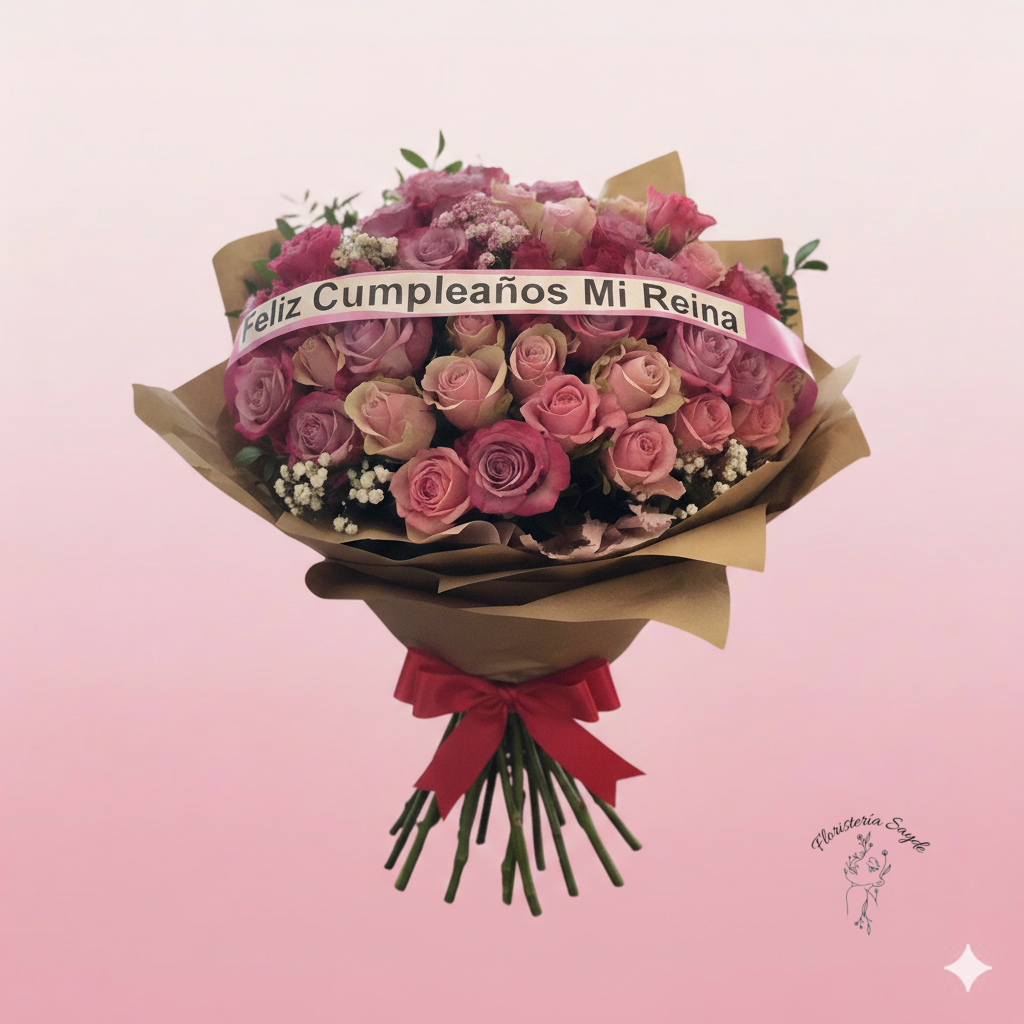 Cinta con Dedicatoria: Un elemento de personalización que permite que el ramo de rosas rosas premium lleve un mensaje directo, como nuestro icónico «Mi Reina».