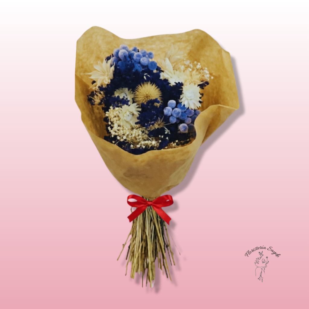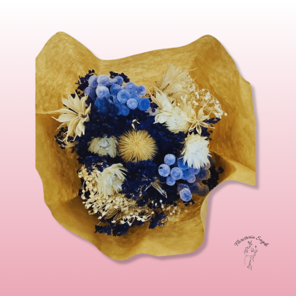 Este ramo flores preservadas en tonalidades azules, blancas y beige es la definición perfecta de una elegancia que no se marchita. Diseñado meticulosamente en Floristería Sayde, cada elemento ha sido seleccionado para crear un equilibrio visual entre la profundidad del azul y la calidez natural de los tonos neutros.