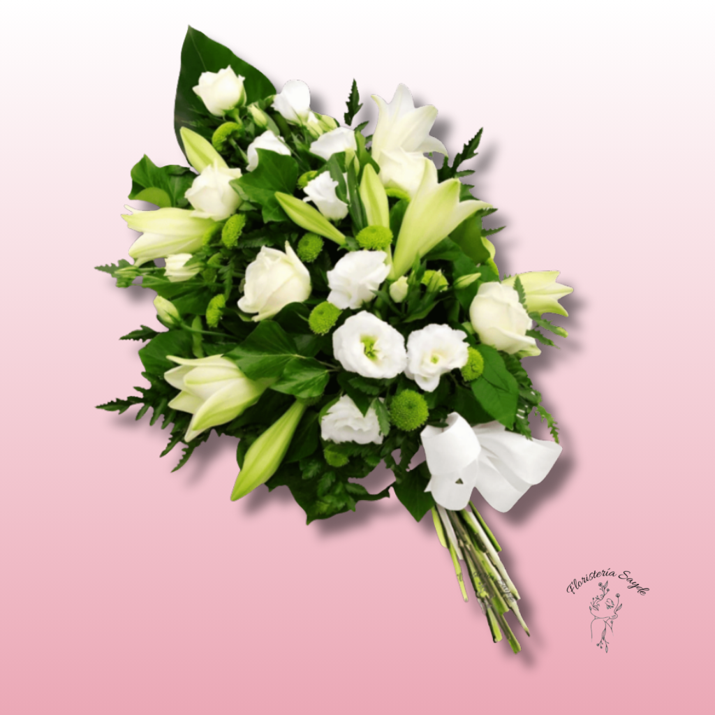 Si buscas un ramo fúnebre blanco elegante, sobrio y con un profundo significado, el Ramo Fúnebre Blanco Elegancia de Floristería Sayde es la mejor opción. Su combinación de lirios, rosas y lisianthus blancos, junto con detalles verdes y un lazo delicado, lo convierten en una elección ideal para honrar la memoria de un ser querido.