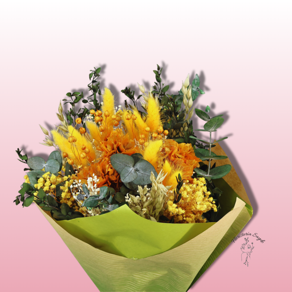 Uno de los elementos más distintivos es, sin duda, el toque silvestre. Hemos integrado espigas de trigo y pequeñas cápsulas de lino que aportan una verticalidad elegante y un aire campestre irresistible. Estas texturas secas y preservadas se entrelazan para crear un efecto tridimensional, haciendo que el Ramo Preservado Amarillo con Eucalipto luzca perfecto desde cualquier ángulo. Cada tallo ha sido colocado manualmente para garantizar una forma de abanico equilibrada y armoniosa.