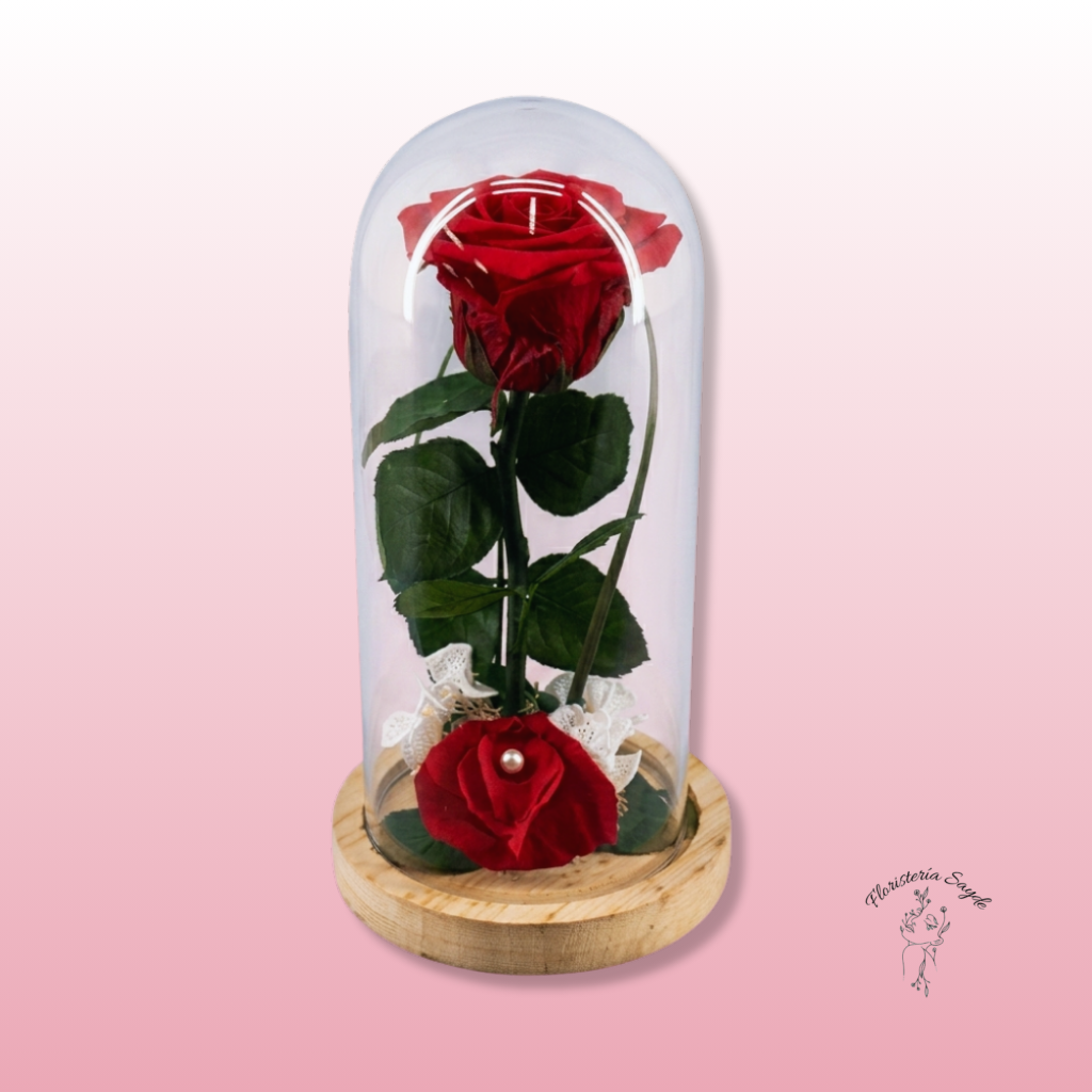 Inspirada en el simbolismo clásico de historias como «La Bella y la Bestia», la rosa preservada en cúpula evoca una atmósfera de misterio y devoción. El diseño que presentamos en Floristería Sayde eleva este concepto con un toque artesanal exclusivo. La cúpula de cristal de alta transparencia actúa como un santuario, protegiendo a la flor del polvo y la humedad, mientras que la base de madera de pino natural aporta una calidez orgánica que encaja perfectamente en cualquier estilo de decoración.