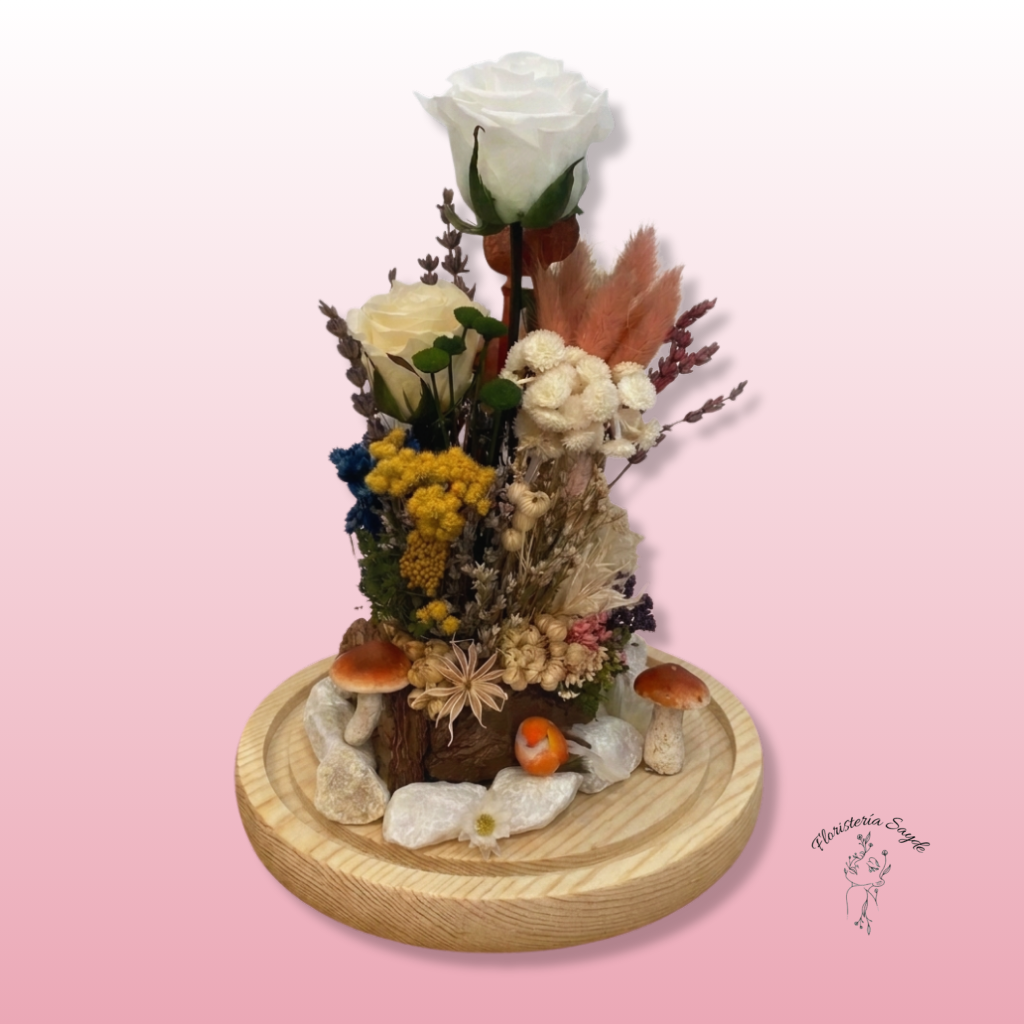 En este modelo específico, la composición se enriquece con un paisaje botánico detallado. A los pies de la rosa principal, encontramos una selección de musgo preservado, flores auxiliares de colores vibrantes como la paniculata y pequeños detalles decorativos que crean un escenario tridimensional. Es, en esencia, un pequeño jardín secreto protegido bajo cristal, listo para contar una historia de amor personalizada.